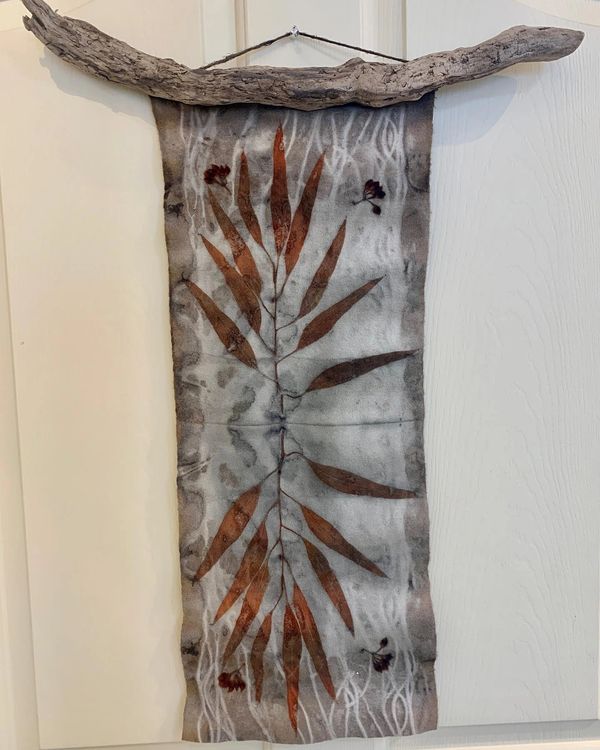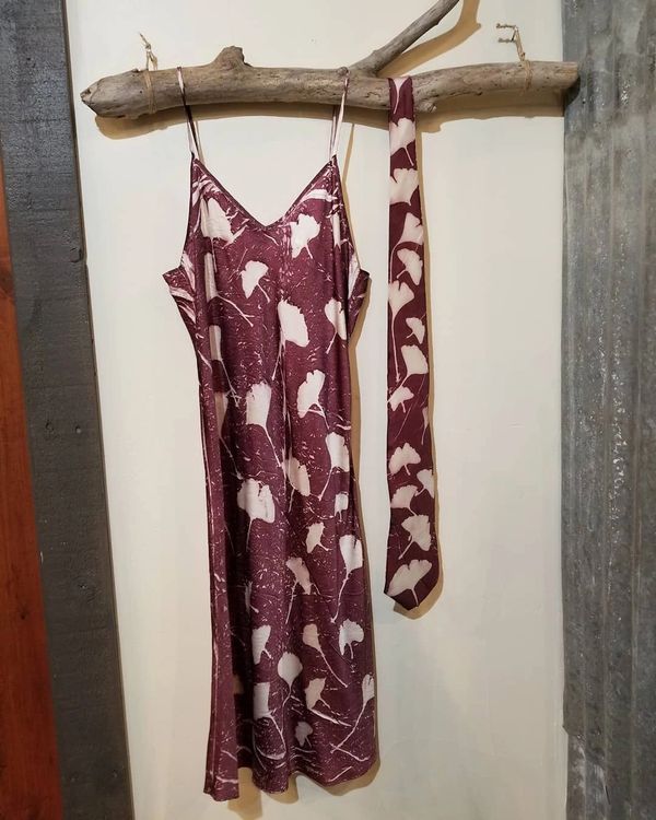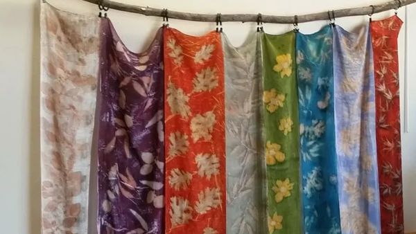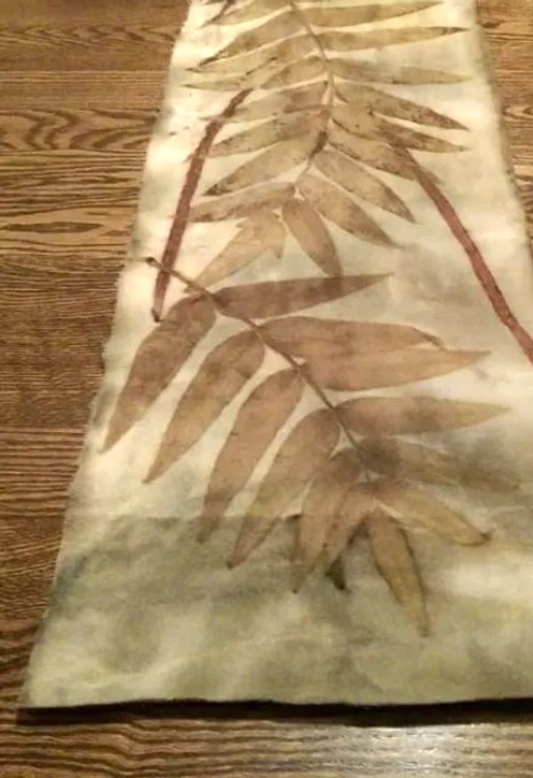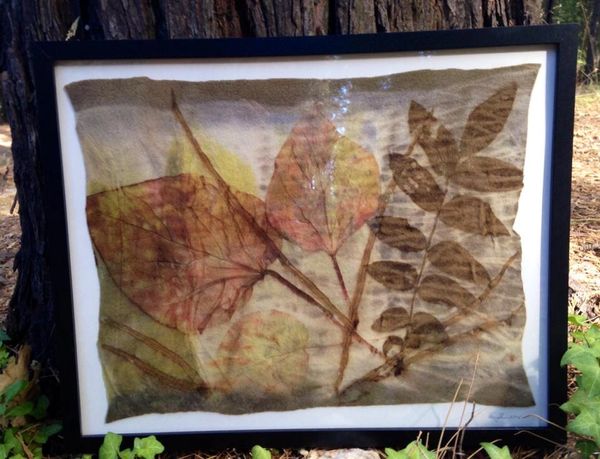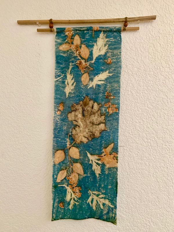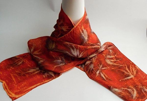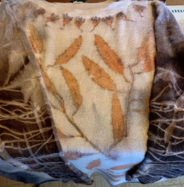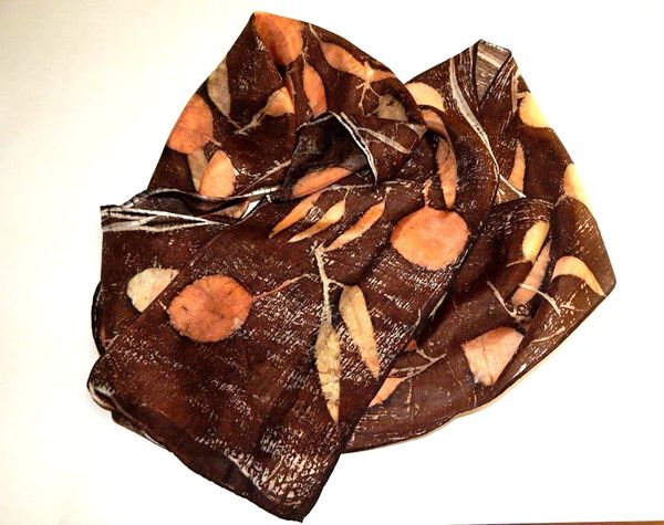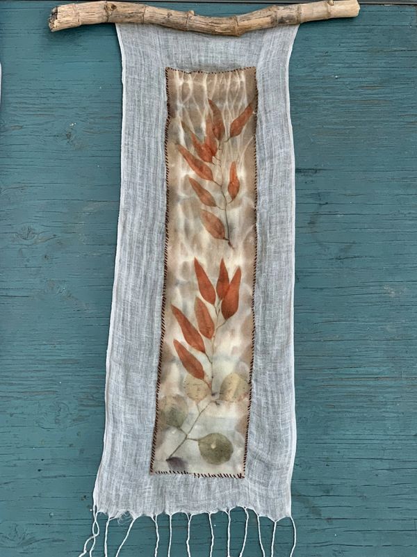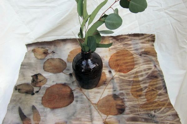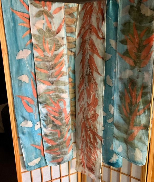 Dying using leaves, bark, stem of botanicals. My favorites are Eucalyptus, Catalpa, Casuarina, Walnut, Maple, Oak and Gingko. I also love to experiment with new finds, you just never know! While some leaves produce extraordinary color others have beauty in their shape, making them a lovely resist for traditional dye-work.